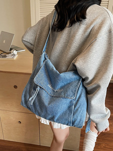 新款跨境水洗刺绣牛仔单肩托特包女日韩休闲邮差包简约斜跨文艺包