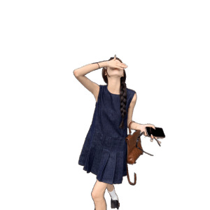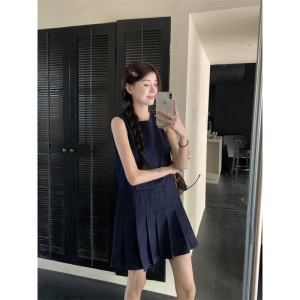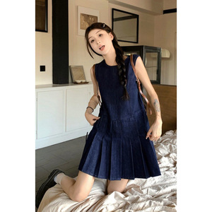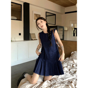 レトロ文学デニムベストドレス女性の夏フレンチルーズ痩身ノースリーブプリーツスカートドレス