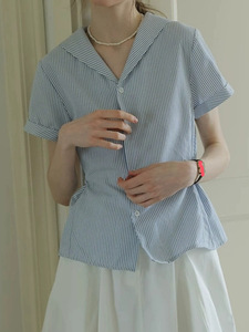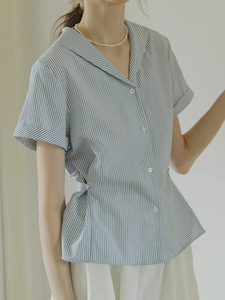 フレンチ通勤ネイビーカラーストライプ半袖シャツ女性用2025夏カレッジスタイルデザイン年齢軽減痩身トップ