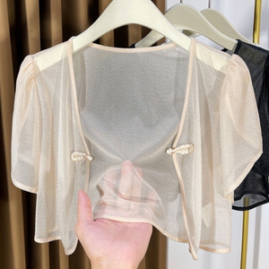 新しい中国風の女性用半袖カーディガン、夏のサスペンダー、日焼け止めショール、女性用の光沢のあるバックルの薄いブラウス、卸売