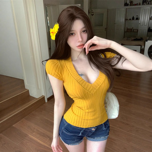 オールドマネースタイルディープVネックピットストリップ高弾性ニットアイスフィールウエスト半袖Tシャツレディース夏スリムウエストショートトップ
