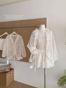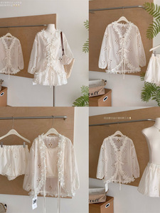 Sun Yanxia Mengxiluohua スイート V ネックレース中空フラワールーズシャツ + ハイウエストショーツセット