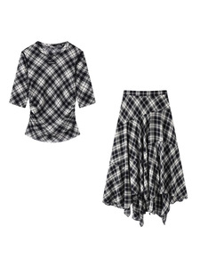 2025 秋の新作レディーススリム不規則チェック柄プリーツトップ MBE3TOP003 スカート MBE3SKT039