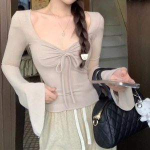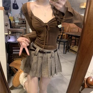 純粋な欲望スタイル巾着レースアップスクエアカラー長袖シャツ女性のための初春の新しいスタイルのスリムフィットへそ出しホットガールトップ