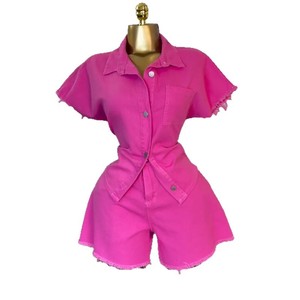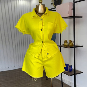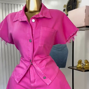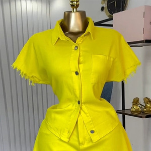 ヨーロッパとアメリカのクロスボーダー婦人服 2025 夏の新ファッションラペル半袖デニムトップワイドレッグローエッジショーツスーツ