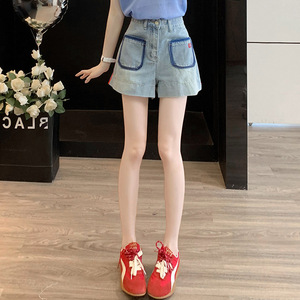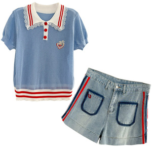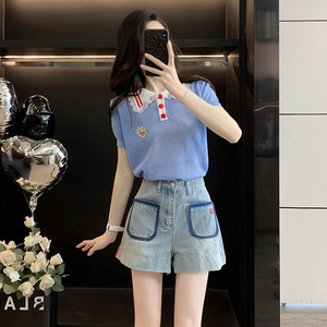 西洋風年齢軽減カジュアルファッションスーツ女性の夏シックな韓国風ブルー半袖トップデニムショートパンツ 2 点セット
