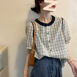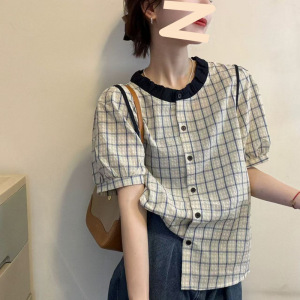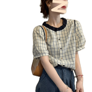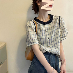 2025 夏の新ファッションベビードール襟チェック柄コントラスト半袖シャツ女性のパフスリーブファッショナブルなトップ