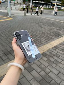 白い犬柄のチェック柄iPhone 17 Pro用スマホケース アクリル製 iPhone 16/15対応 漫画風透明ケース 13/12にも対応