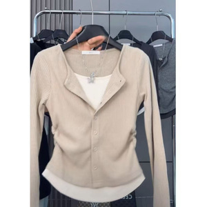 コントラストカラーステッチフェイクツーピースシングルブレスト長袖シャツ女性用2025秋プリーツウエスト痩身ボトムストップ