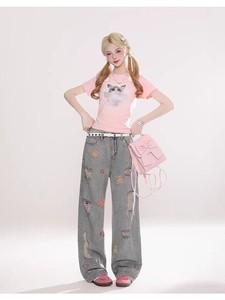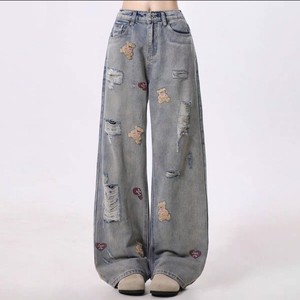 2025夏季新款小熊刺绣破洞牛仔裤女美式复古高街宽松阔腿裤