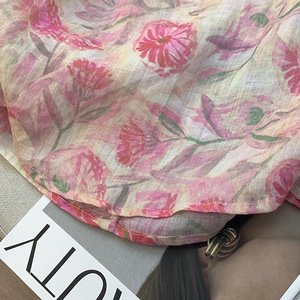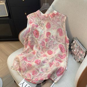 2025 新しいスタイルの花柄コットンとリネンのノースリーブピンクトップ夏薄いホルターネック中国風花柄シャツ