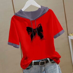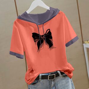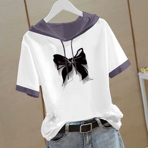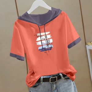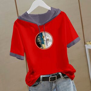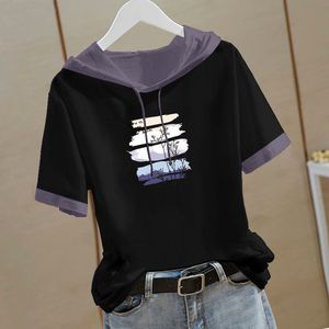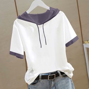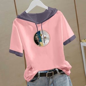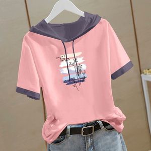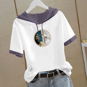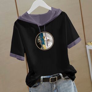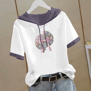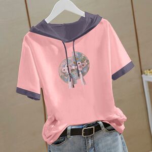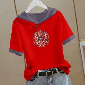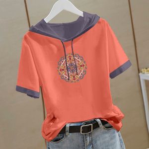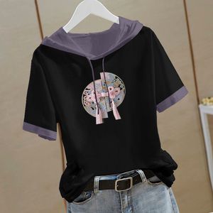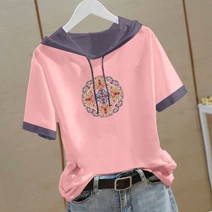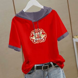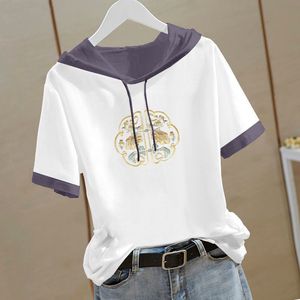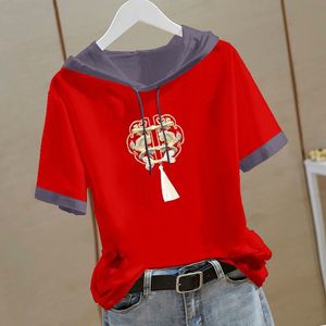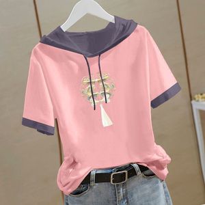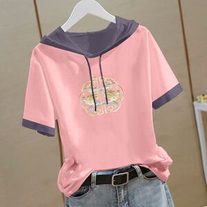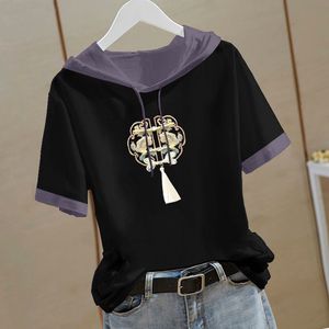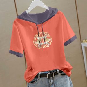 新しい中国風の純綿半袖スウェットシャツ女性のための 2025 夏の新しい中国風の Tシャツフード付き半袖ルーズトップ