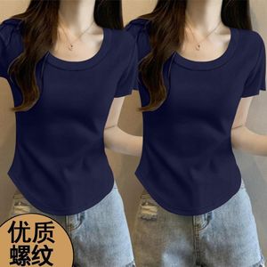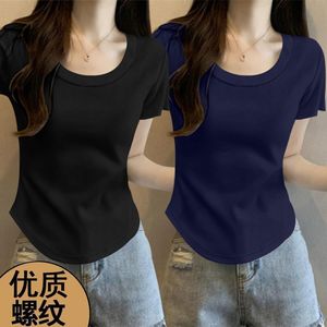2025 夏の女性のスリムラウンドネック不規則なトップはシンプルで合わせやすい無地通気性半袖スレッド T シャツ