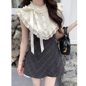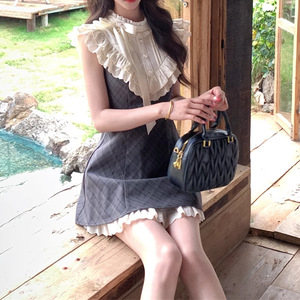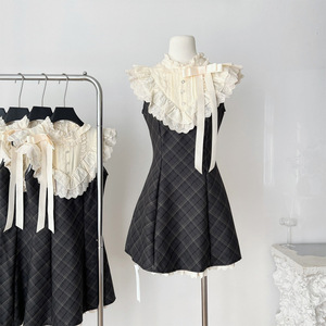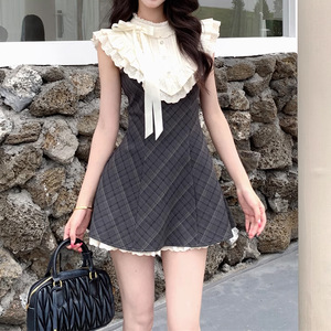 ZHOYUE ユリガールフレンチレトロチェック柄ドレスレースステッチノースリーブショートスカートラウンドネック