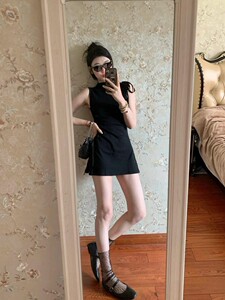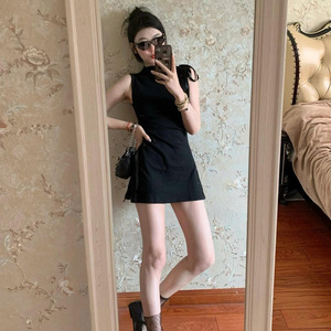 フレンチピュアセクシースタイルブラックノースリーブベストドレスレディースデザインニッチスリムショートスカート夏