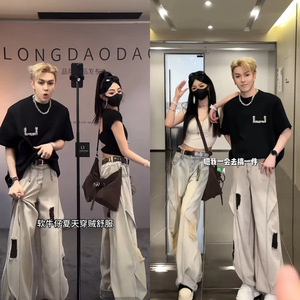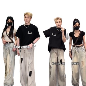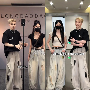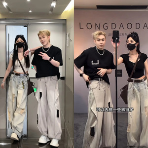 春夏新品水洗破洞设计牛仔裤男裤美式高街休闲弯刀裤个性宽松长裤