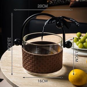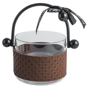 ブラックビーズU字ハンドルガラスアイスペール - 編み込みブラウンレザー+ブラックリボン