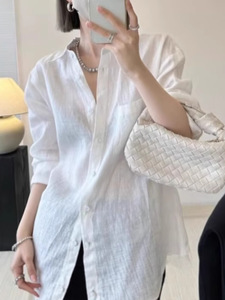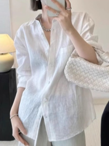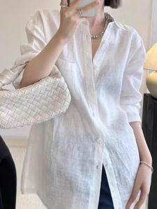 女性用フレンチホワイトリネン長袖シャツ、夏用薄手ゆったりコットンリネンシャツ、微透けトップ付き