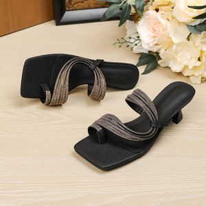 女性のためのラインストーンスリッポンハイヒールサンダル夏 2025 新しいスタイル多用途ファッションハイヒールサンダルワンライン厚いヒールスリッパ