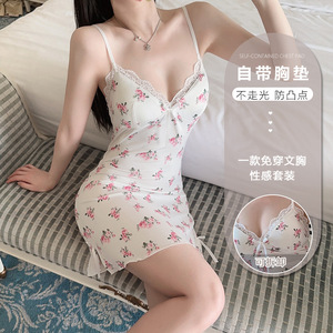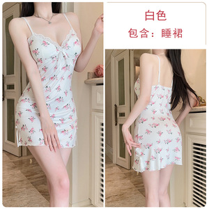Guiruo の新しい滑らかなアイスシルクパジャマ、情熱的でホットな胸パッド付き、大きいサイズの軽い高級花柄サスペンダースカートスーツ 5296