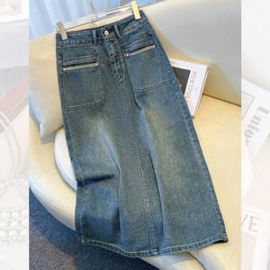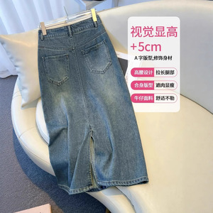レトロデニムスカートレディース夏ミドル丈2025新作ハイウエストストレートヒップスカート小柄なAラインスカート