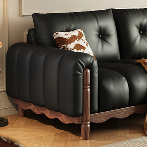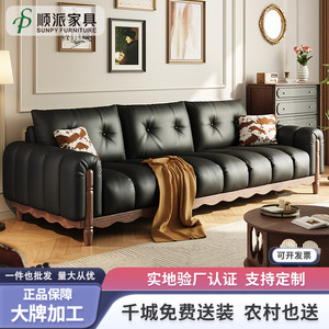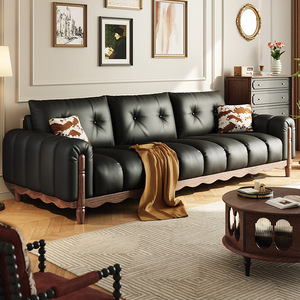 レトロ本革ソファフレンチビッグブラック牛中世スタイル黒第一層牛革リビングルームハイエンドストレートレトロソファ