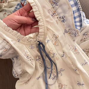 女性用パジャマ夏 2025 青いチェック柄スプライシングバニー花柄小さなフライングスリーブパジャマ女性はかわいいホームスカートを着ることができます