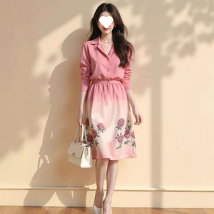 2025 春の新中国風の女性のピンクのポロカラーウエストローズプリントドレス超見栄えの良い絶妙なスカート