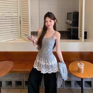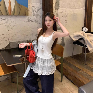 大きいサイズの裾ステッチレースサスペンダーレディース春新作ファットmmノースリーブインナーレイヤードベストボトリングシャツ