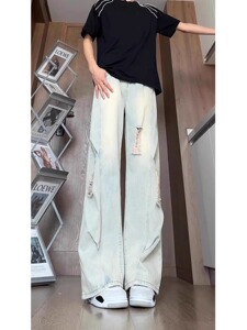 ライトブルーのデコンストラクトパッチワークリップジーンズメンズ夏アメリカンハイストリートバイブパンツスリムストレートレッグブーツカットパンツ