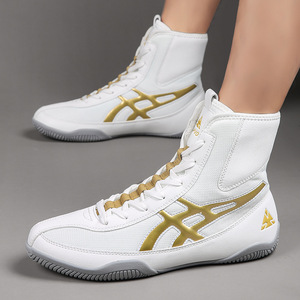 男性と女性のためのプロレスシューズ、ハイトップボクシングシューズ、ファイトトレーニングシューズ、ロングブーツ、ムエタイファイトフィットネスメッシュサンダーシューズ