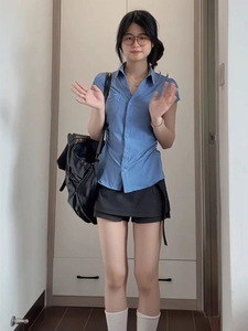 韓国カレッジスタイルポロカラー半袖シャツレディース2025夏新作ホットガールスリムフィットピンチウエスト万能トップ