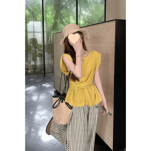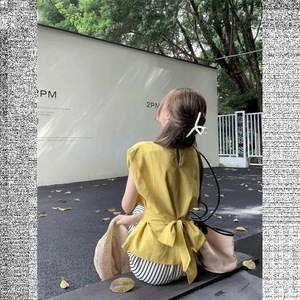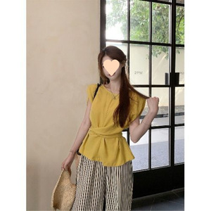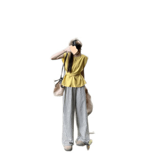 気質スーツバックストラップボウベストレディース2025夏ストライプワイドレッグフロアレングスパンツ2点セット
