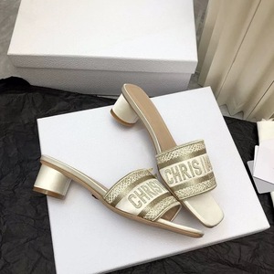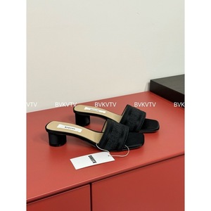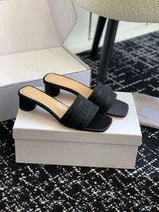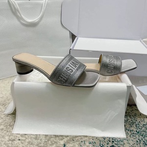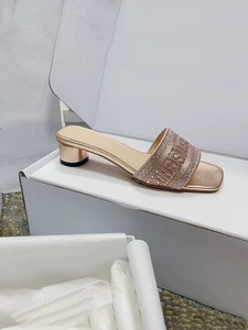 25s 夏新作 D ファミリースクエアトゥワンストラップシルクレター刺繍ラウンドヒールスリッパ女性用ホットラインストーンハイヒールサンダル