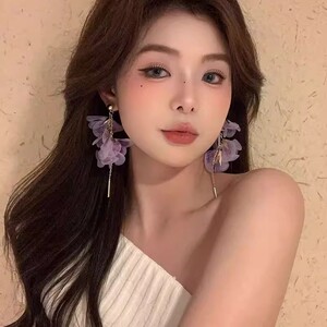 スーパーフェアリーパープルメッシュ花びらタッセルイヤークリップ女性用、甘いスタイルのイヤリング、絶妙で美しいイヤリング、ユニークで誇張されたイヤリング