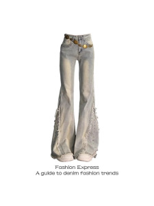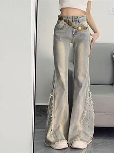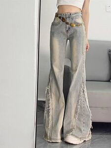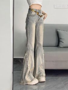 复古美式毛边拼接高腰喇叭牛仔裤新款辣妹设计修身显瘦马蹄拖地