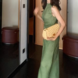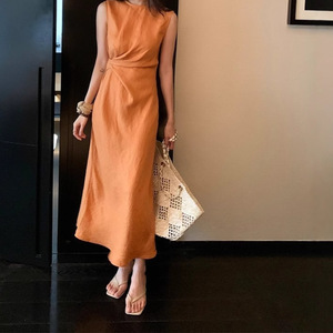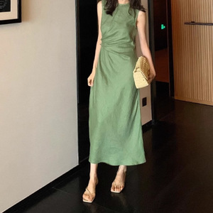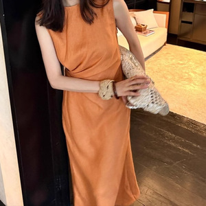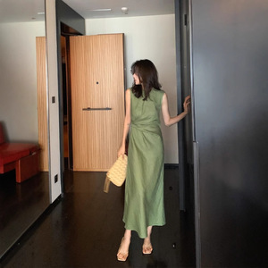 2025 夏セレブ気質フレンチウエスト痩身ストラップノースリーブドレスハイウエストプリーツデザインロングスカート