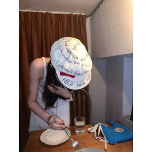 INS 甘くてクールな落書き文字フラットトップハットかわいいプリントリボンキャスケット帽女性の顔が見える小さな春と秋の八角形帽子