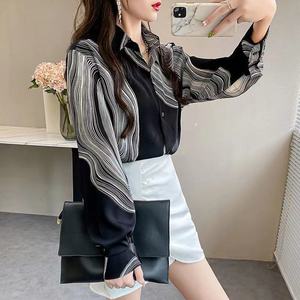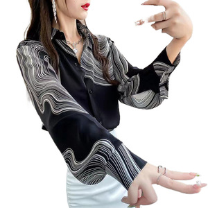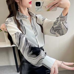 女性用の長袖トップデザイン、女性用のニッチなルーズシフォンプリントシャツ、女性用の春と秋のラペルスタイルシャツ