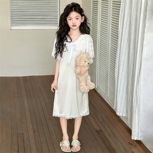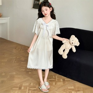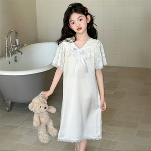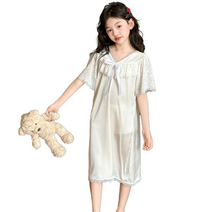 女の子のハイエンドアイスシルクパジャマ 2025 新しい子供の夏の薄いレースのパジャマドレス女の子プリンセススタイルパジャマ
