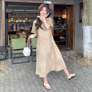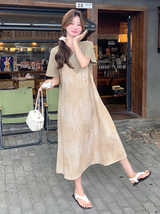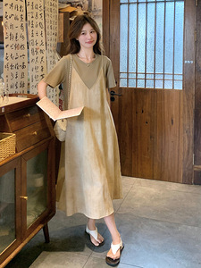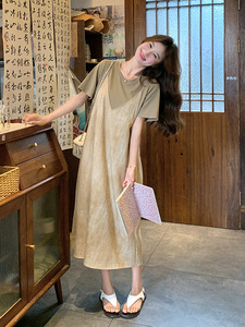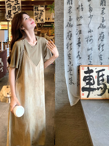 VII グレーステッチフェイクツーピースドレスレディース夏新作シンプルでエレガントな韓国風ラウンドネック半袖通勤