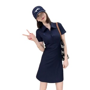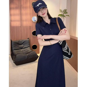 2025 新しい夏のソリッドカラーのロングネイビーポロスリム気質カジュアル多用途韓国スタイルウエストドレス