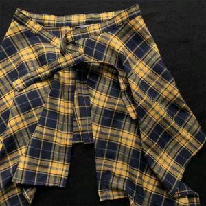 今年人気のカラフルな黄色のチェック柄バットカーテン、女性用ワンピースレースアップ黄色のチェック柄カーテン、男性用裾、男の子用シャツ