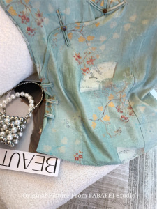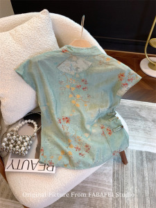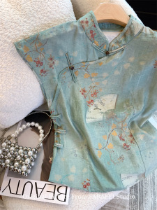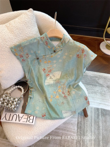 グリーン新中国風のボタン付き小さなフライングスリーブリネンシャツ女性のための 2025 夏クール禅中国風チャイナドレス襟トップ