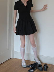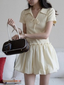 EGGA カスタードポロカラーリボン半袖ドレス夏の新しいフレンチ V ネックスリムフィット A ラインスカート