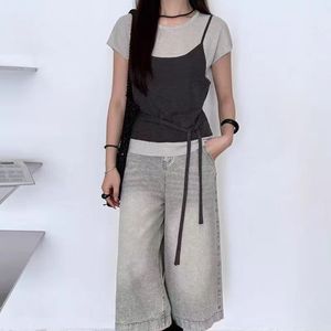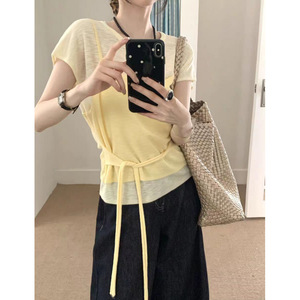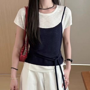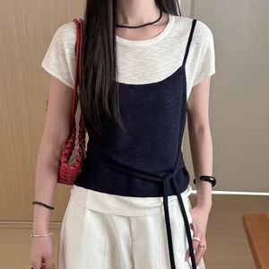 女性のための偽ツーピースサスペンダーニットセーター夏 2025 新しい薄いファッショナブルなデザインスプライシングスリム半袖トップ