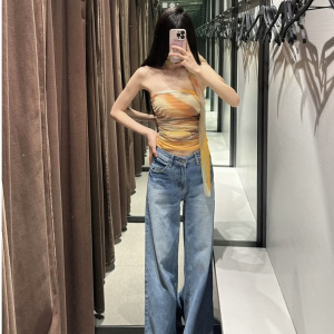 メッシュスタイルの女性のプリーツチューブトップアメリカンプリントレトロスタイルアウターショートベストワンショルダー弾性ホットガール