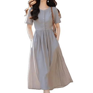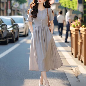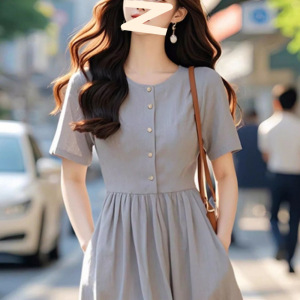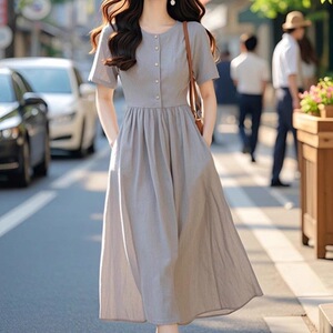 痩身と年齢を減らすドレス婦人服 2025 夏の新しいロングスカート美しいユニークなフレンチスタイルラウンドネックグレー