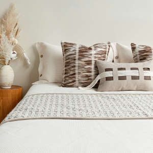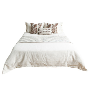 中古わびさび風ベージュ寝具8点セット ホテル・B&B ソフトインテリアモデルルーム ベッドフラッグ ベッドサイドクッション