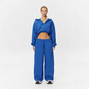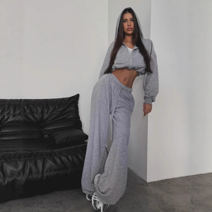 ヨーロッパとアメリカの女性のカジュアルスーツ無地長袖ジッパーカーディガン巾着フード付きスウェットシャツスポーツ弾性パンツ 2 点セット